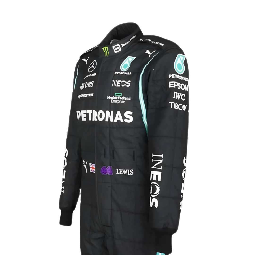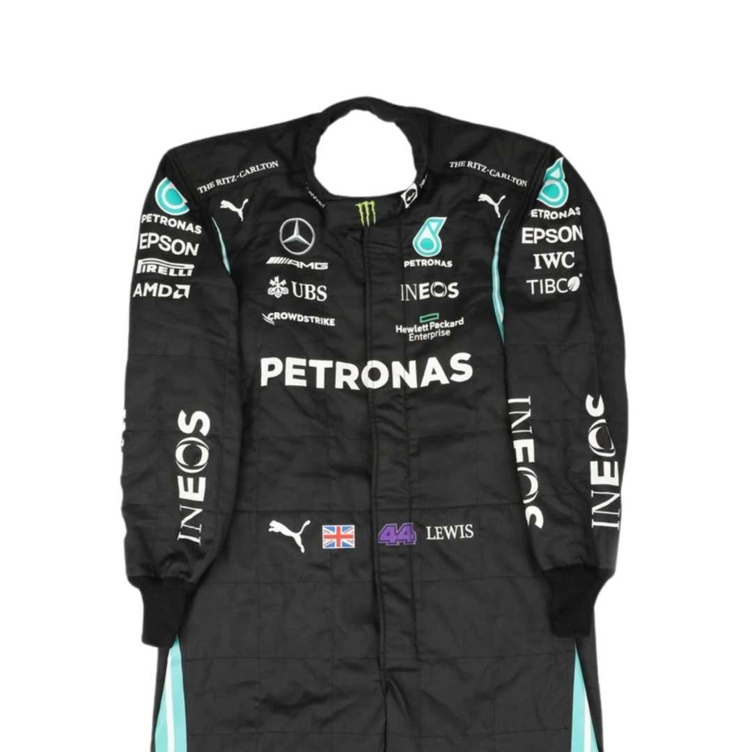 Featuring the sleek black Mercedes AMG Petronas design with teal and sponsor detailing, this suit reflects the power, speed, and determination Hamilton showed on the track.